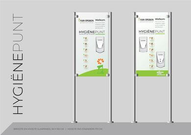 Ook is deze handdesinfectiezuil-hygienepunt leverbaar waarbij de glazenplaat word vervangen door een plaat van trespa-materiaal.